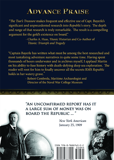 The book documents Capt. Bayerle's personal journey to uncover Republic's secrets along with his extensive research in an effort to substantiate or deny the rumors. The result is a deep-sea adventure riddled with subtle clues and impressive historical photos and documents. The reader is invited to examine the evidence and arrive at his or her own conclusions surrounding the century-old mystery of what may become the greatest treasure recovery of all-time.